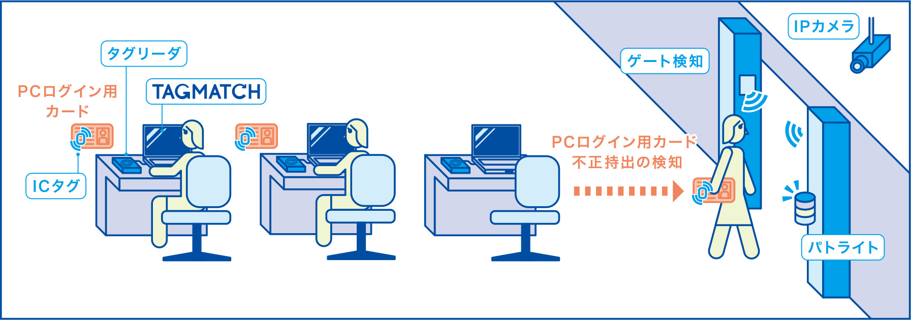 タグマッチならPCログインカードにICタグを貼って、不正持出を防ぐことができます。 出入口にオプションのゲートパトライト、IPカメラを設置することで、PCログインカードの不正持出を検知し、アラートを鳴らすことができます。