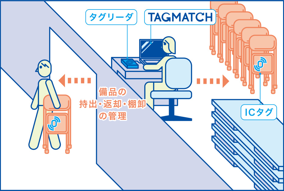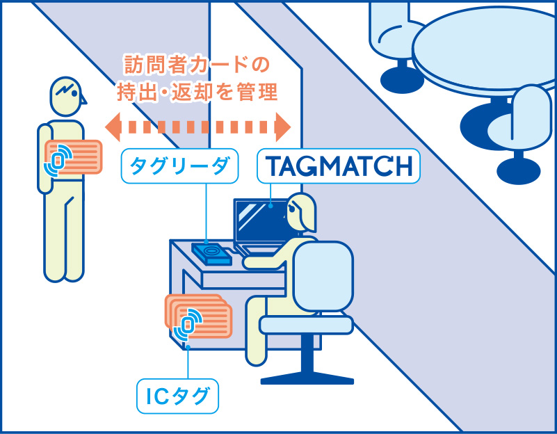 タグマッチならICカードの訪問者カードを使い、備品にICタグを貼るだけで、訪問者の備品持出・返却や棚卸が簡単に管理できます。